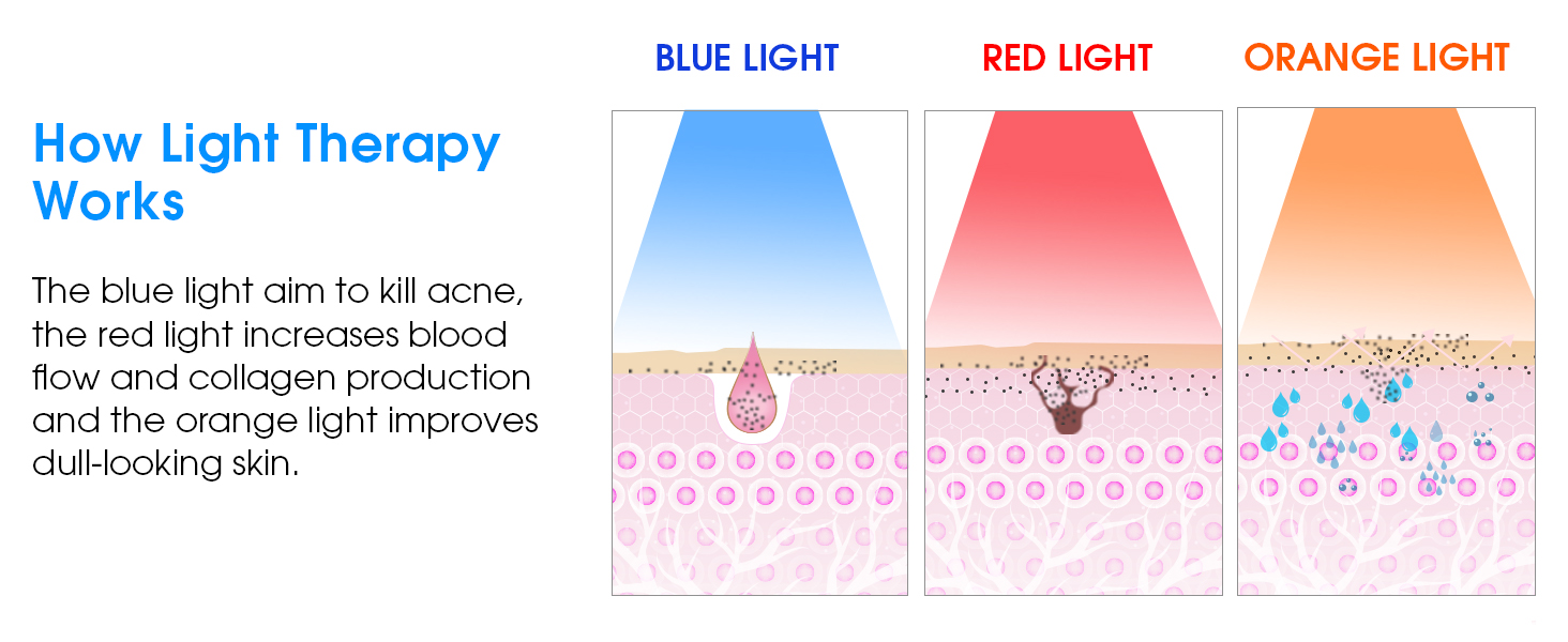 - Features Proved Light Therapy Technology – Individually 3 lights(bule/red/orange). Blue and red light reducing the existing inflamed breakouts and targeting spots before they appear, blue light targets acne-causing bacteria while red light reduces acne inflammation, the orange light improve the dull-looking skin.